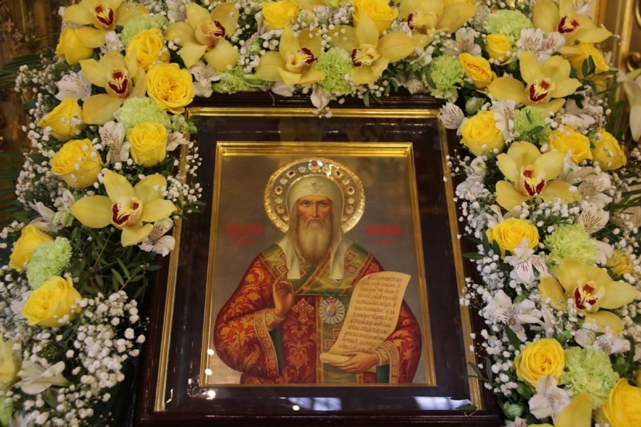 Яко сокровище пребогатое, многолетно в земли сокровенное, / честныя мощи твоя обретошася чудоточащия, / всеблаженне отче святителю Алексие, / от нихже врачевство приемлюще, обогащаемся / и Христа славословим, глаголюще: // слава прославляющему святыя Своя.