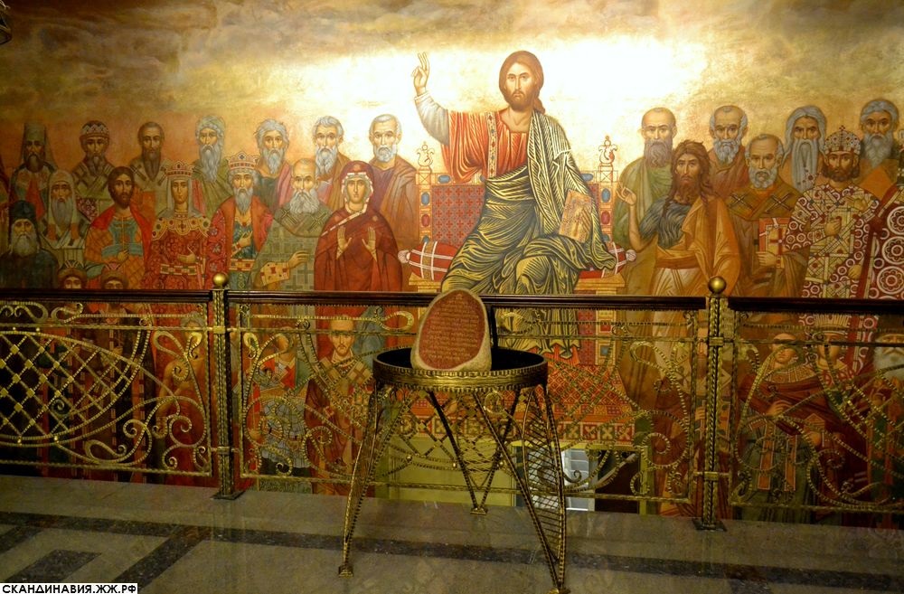 3. Центр композиции украшает изображение Христа на престоле в окружении наиболее почитаемых христианских святых. Перед фреской установлен камень, освящённый патриархом Кириллом в 2013 году в основание возводимого сейчас на территории Сретенского монастыря храма Новомучеников и Исповедников Церкви Русской на крови, что на Лубянке. За живописной оградой — лестница, ведущая вниз, в актовый зал семинарии.
