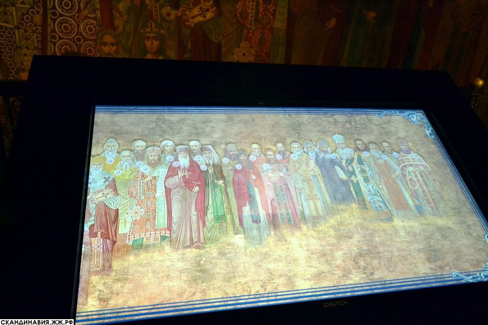 4. Кто есть кто на фреске, поведает электронный информационный стенда здесь же в вестибюле. Легко узнаваемы изображения великих русских писателей Николая Васильевича Гоголя и Фёдора Михайловича Достоевского.