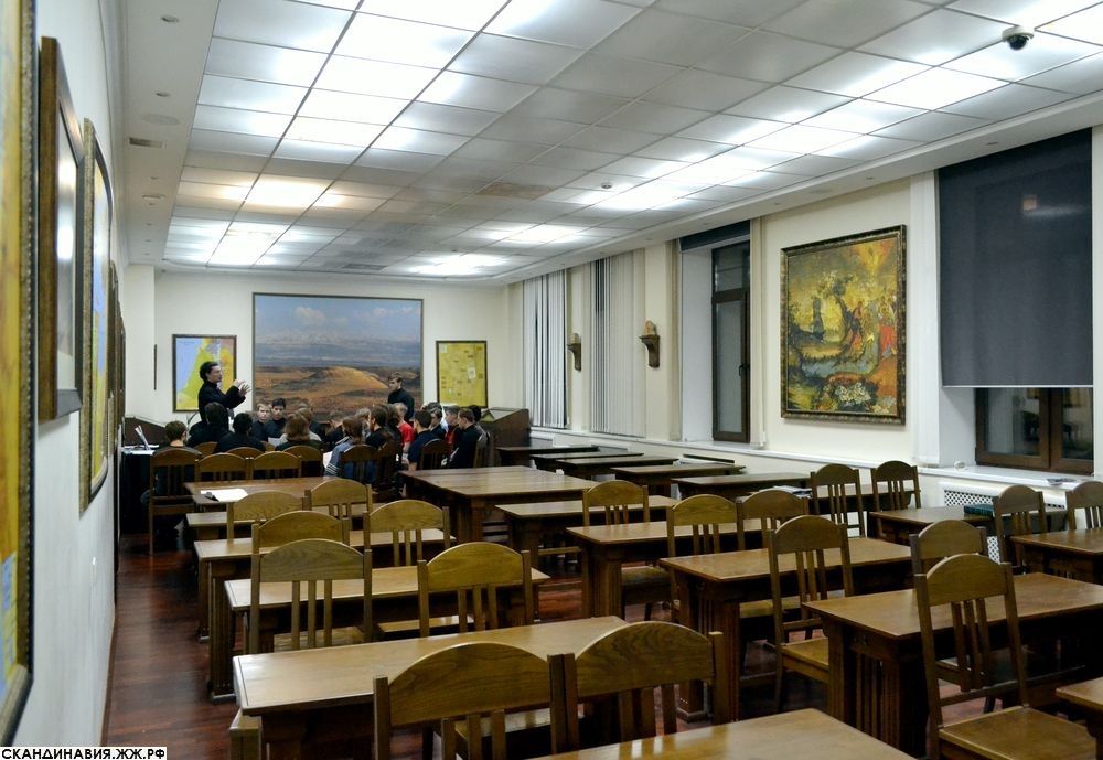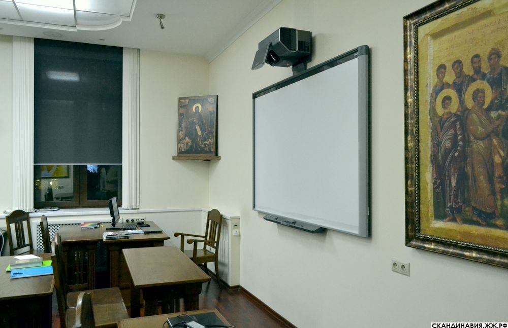 — Давайте потихоньку заглянем, — предлагаем мой спутник, и я, конечно же, не могу отказаться. Каждая деталь интерьера в аудитории «Святая Земля» изысканна, и вместе с тем проста, вся мебель изготовлена из настоящего дерева. Картины, снова картины, и, конечно же, иконы, перед которыми студенты молятся перед началом каждого занятия. О том что на дворе стоит XXI век напоминает светящийся потолок и склонившийся над интерактивной доской футуристичного вида проектор (таких я ещё не видел).