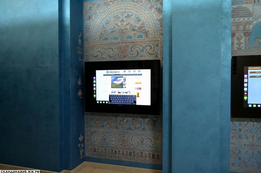 5. В Церкви есть место и высоким технологиям, потому на втором этаже семинарского здания тоже установлены информационные стенды. На экранах, экзотически смотрящихся среди росписей, виднеется заглавная страница портала «Православие.Ru», главный редактор которого владыка Тихон. С помощью стендов студенты узнают расписание занятий и заглядывают в библиотечный каталог.