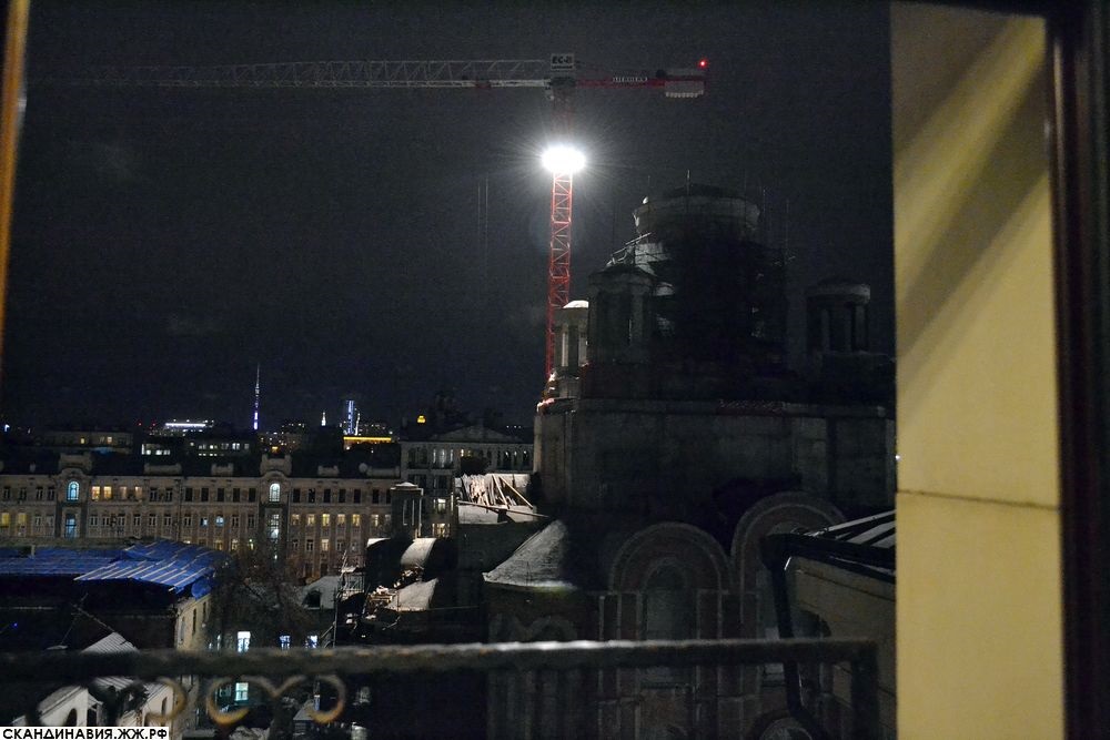 17. Вид на Москву, открывающися из обрамлённых красивыми коваными решётками больших окон архондарика, конечно, впечатляет. На переднем плане виден тот самый строящийся храм Новомучеников и Исповедников Церкви Русской на крови, что на Лубянке. Планируется, что его освящение состоится уже в следующем году.