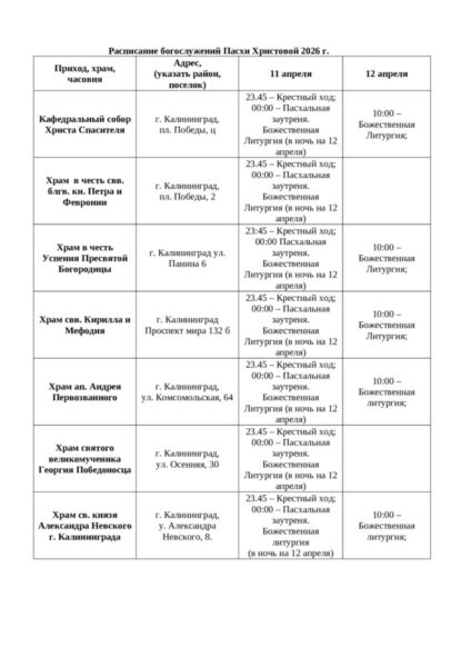 12 апреля 2026г. Православная церковь встретит Светлое Христово Воскресение. Публикуем расписание Пасхальных богослужений в храмах епархии: