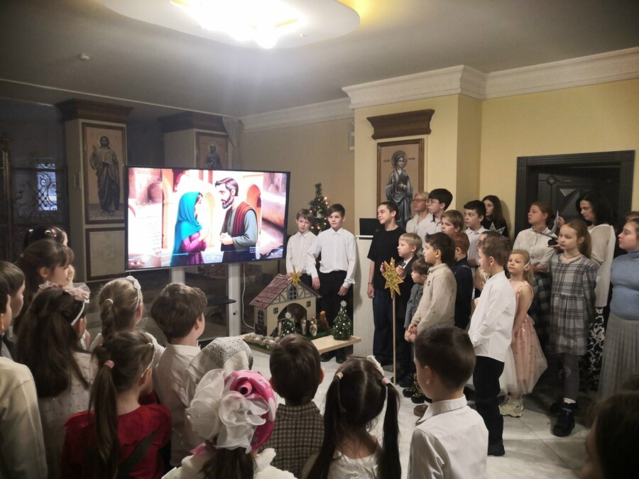 Две старшие группы под руководством своих наставников, педагогов, священников спроектировали и реализовали сценарий, в котором подняли актуальную и серьезную проблему утраты главного смысла и христологических ценностей праздника Рождества Христова.
