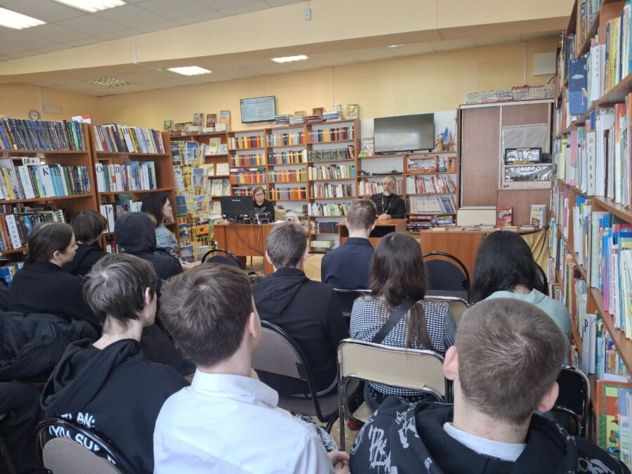 В мкр. им. Александра Космодемьянского г. Калининграда прошла встреча благочинного Приморского округа, настоятеля храма свв. бессреб. Космы и Дамиана иерея Сергия Василевского с учащимися 9-х классов средней школы N9 в Библиотеке микрорайона.