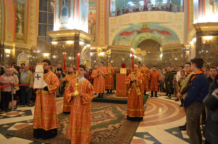 Размещено 29.04.2019 в 900 × 596 в В праздник Светлого Христова Воскресения архиепископ Серафим возглавил пасхальное богослужение в Кафедральном соборе Христа Спасителя