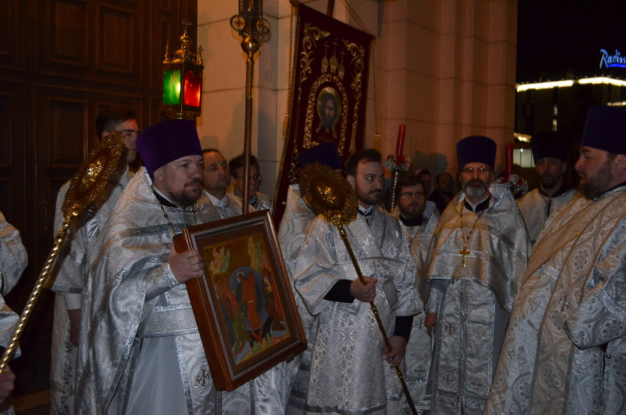 Размещено 08.04.2018 в 900 × 596 в В праздник Светлого Христова Воскресения архиепископ Серафим возглавил пасхальное богослужение в Кафедральном соборе Христа Спасителя